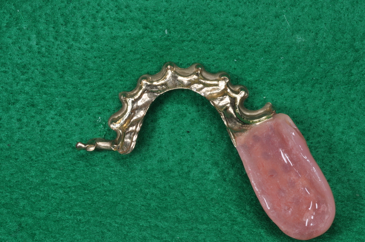 本義歯は精密・正確なミリング面で構成され、機能面、審美面で最高ランク(針金などはなく金属面はほとんどみえません)の部分入れ歯になります。精密に設計されたミリング面にピタッと装着された義歯は、全く遊びがなくよく噛める唯一無二の義歯です.動揺していた歯も、この義歯を装着するとしっかりすることが多々あります(クロスアーチスプリント効果、歯軸に垂直に力がかかりやすいような設計、パーシャルパラレルミリングデンチャーとはやや設計が異なります)。